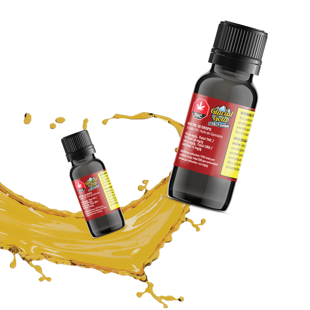 Glacial Gold MAX THC 30 Drops feature THC distillate & organic MCT oil from coconuts. Our maximum strength 30mg/g THC formula provides a total of 1000mg of THC per 35ml bottle. Glacial Gold high-purity distillate is processed through a patented closed-loop chilled alcohol extraction process including multi-stage refinement, purification, and distillation. Each bottle includes a click-dose syringe for easy dosing, with 8.6mg of THC per 0.3ml syringe.
